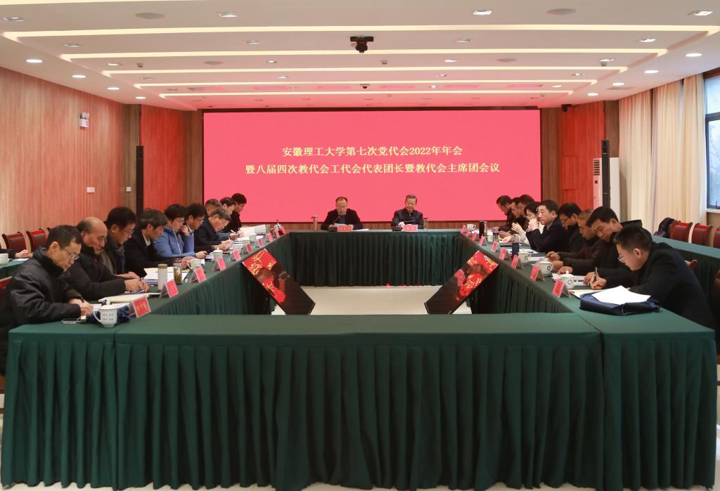 2月18日下午,校第七次党代会2022年年会代表团团长会议暨八届四次教代会主席团第一次会议在舜耕苑二楼会议室召开。校党委书记郭永存主持会议。校党委副书记、校长袁亮,校党委副书记、常务副校长虞宝桃出席会议。